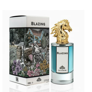Blazing comes in a vibrant, premium box with a stylish design. The perfume bottle features a minimal yet classy look, topped with a golden horse-shaped cap. The mint-tinted juice inside adds a refreshing visual touch.