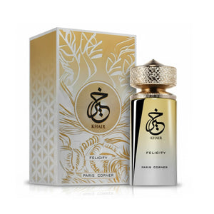 Khair Felicity by Paris Corner is a luxurious unisex Eau de Parfum that embodies sophistication, confidence, and charm. This captivating fragrance opens with bright citrus and fruity tones, followed by a heart of delicate florals and warm spices. The base settles beautifully into creamy woods, amber, and musk, creating a perfectly balanced scent that feels both modern and timeless.